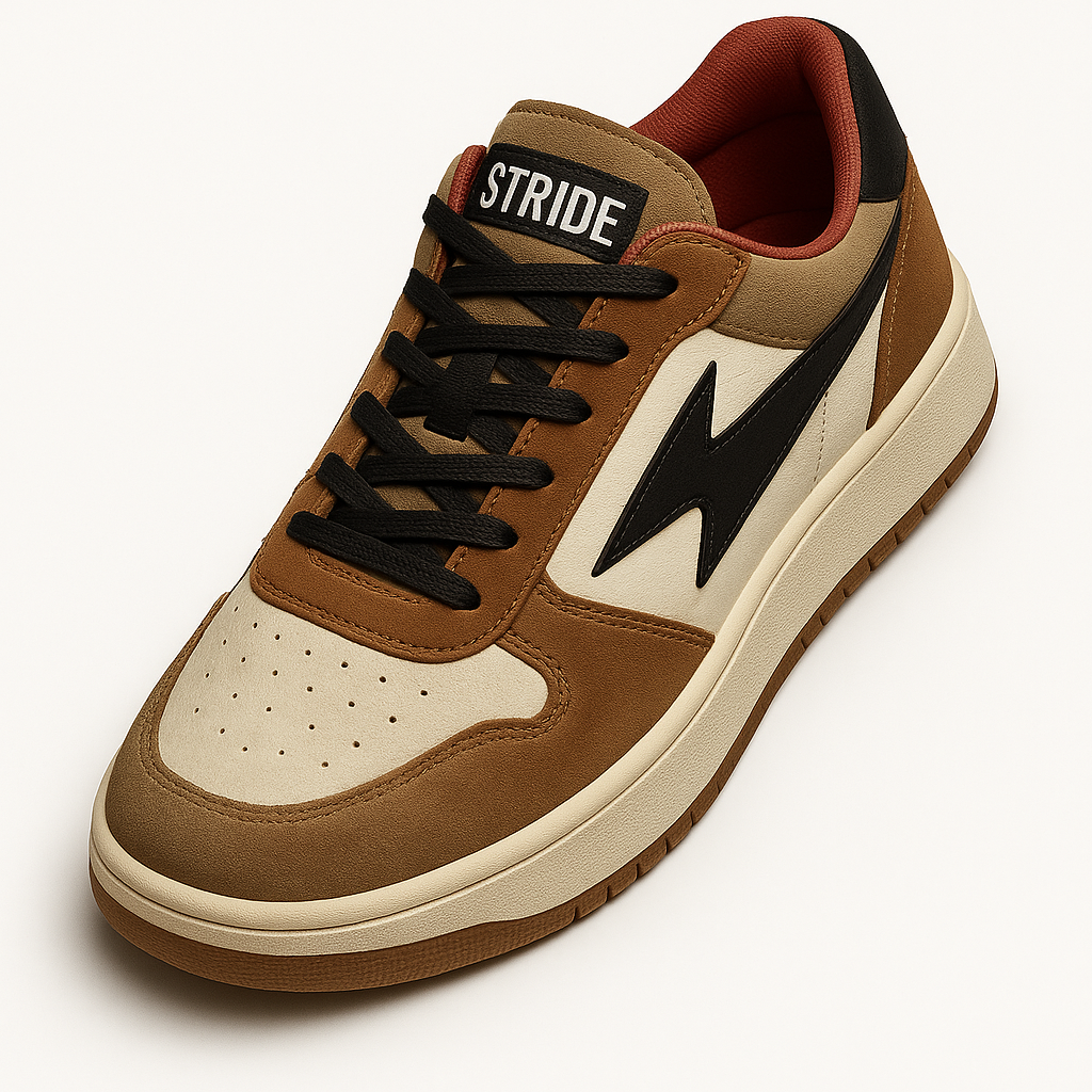Step into timeless style with the Stride Bolt Classic sneakers. Blending a vintage athletic silhouette with contemporary streetwear aesthetics, these sneakers feature a rich mix of earthy tones and standout black lightning bolt detailing on the sides. The upper combines durable suede overlays with breathable mesh panels, ensuring lasting wear and comfort. Finished with signature “STRiDE” branding on the tongue and insole, this pair is built for those who walk with purpose and flair.