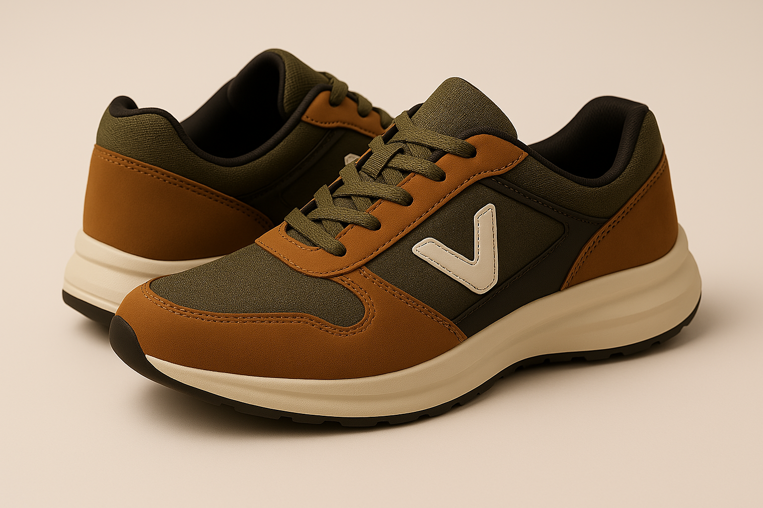 Urban Trekker Dual-Tone Sneakers : Step into effortless style and all-day comfort with our Urban Trekker Dual – Tone Sneakers. Featuring an earthy blend of olive green mesh and tan faux leather overlays, these sneakers are built for both casual outings and active days. The cushioned midsole and durable rubber outsole offer superior grip and shock absorption, while the bold “V” emblem adds a sporty vibe to your look.
